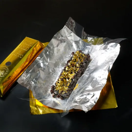 北海道産大豆で作った金箔入りの本格納豆。パッケージも金塊をイメージしています。